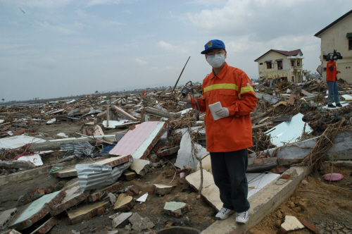 翟伟在班达亚齐遭受海啸袭击后的海边废墟采访中国国际救援队执行清理遗体任务