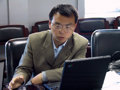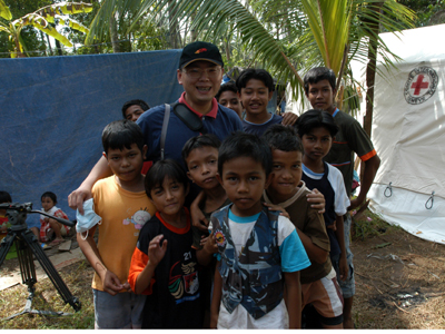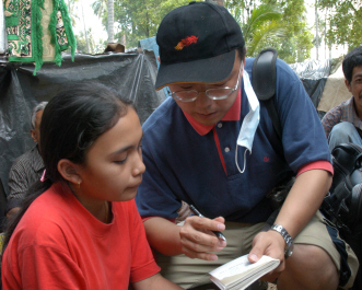 记者翟伟在班达亚齐重灾区一灾民点采访当地灾民