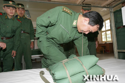 独臂英雄丁晓兵为战士示范打背包的技巧