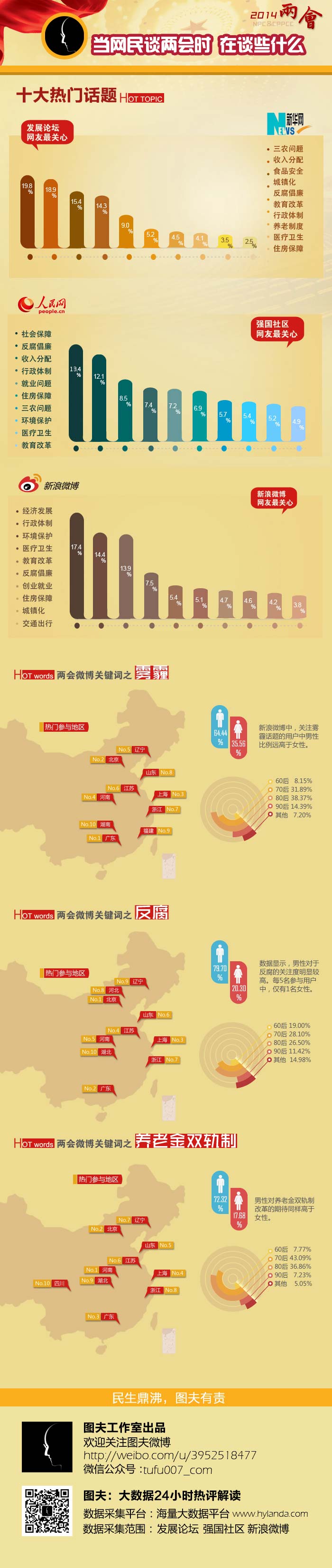 2014年全国“两会”已经拉开序幕,今年“两会”网友最关注哪些问题?新华网《图热now》联合图夫团队进行了跨社交平台数据采集,分析了新华网、人民网、新浪微博等近百万网友留言评论,挖掘网友最关注的“两会”话题,用数据告诉您当网友谈论“两会”时,在谈些什么。