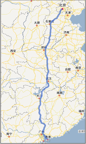 北京-保定-石家庄-邯郸-新乡-郑州-漯河-信阳-武汉-咸宁-岳阳-长沙-株洲-衡阳-郴州-韶关-广州-深圳 -香港(口岸)。