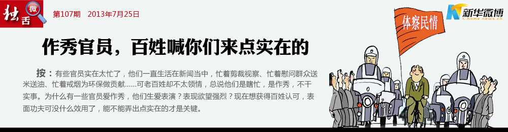 媒体别成帮凶 警车鸣鸣开道,保镖下属随行。摄影师前后乱窜,闪光灯上下齐闪。作秀表演功力强,新旧媒体全帮忙。政绩新闻铺天地,平民百姓早嫌烦。不如多报贴心事,实实在在才叫好。