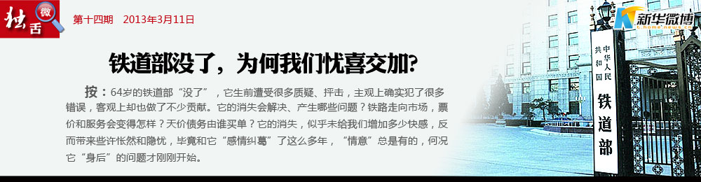 @秋水伊人:之前累积的债务问题如何解决?谁是还债主体?明年春运被“吐槽”的是谁?撤销铁道部体现了改革的决心,希望能有好的转变。