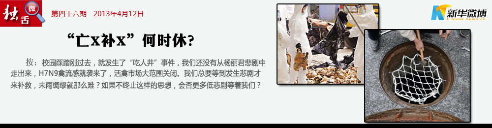 人命的代价,太重 古有亡羊补牢今有"亡"人补井,如果说亡羊补牢是古人的智慧的话,那今天亡"人"补井是某些人对自己不作为的一种补救。莫非事事都要等出了人命才去重视吗?可一出人命,马上就付诸行动。莫非做什么事情都要付出生命的代价吗?