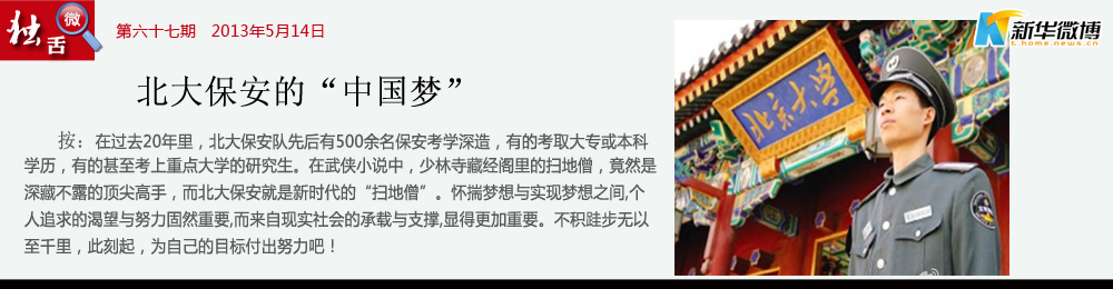 知识改变命运 中国梦是中国人的梦,而在出彩机会上,每个人都会有自己的价值标杆。北大保安们,大都是“有组织有目的”的投身北大,其实这本来就是种奋斗过程。