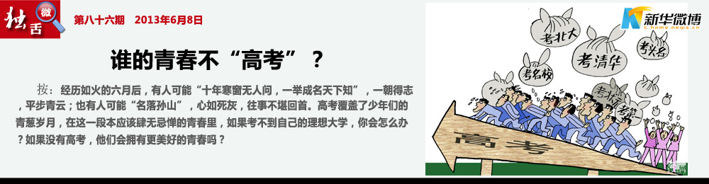 【只是青春的一场过云雨】 一直以为人生只有两段,高考前与高考后,越是临近高考,越是不敢想象未来。世界末日算不上,但世界裁决日毫不夸张。今天看来,关系要好的十几位朋友中,或企业精英,或自主创业,都有让人羡慕的成绩,他们一半高考正常,一半高考失利。