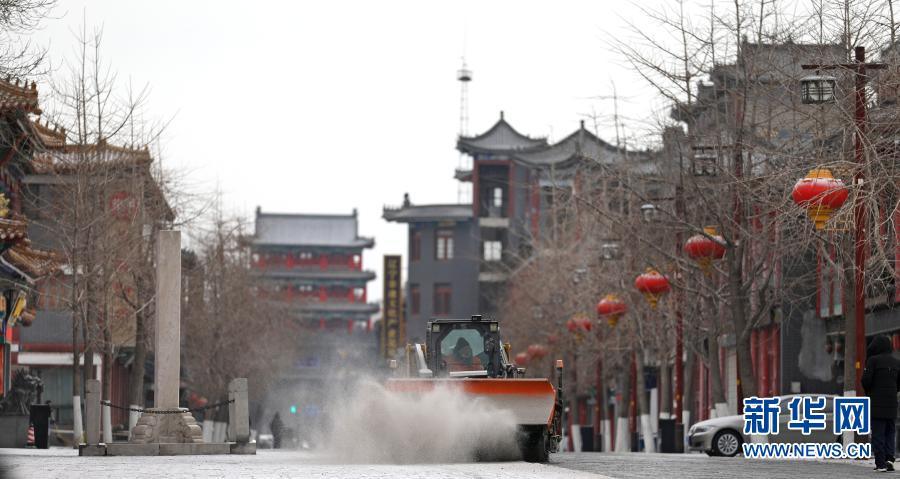 1月13日,一辆除雪车在沈阳故宫外的街道除雪。