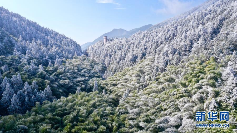 1月8日,武夷山国家公园腹地的桐木关附近,绿树白雪相映成趣(无人机照片)。