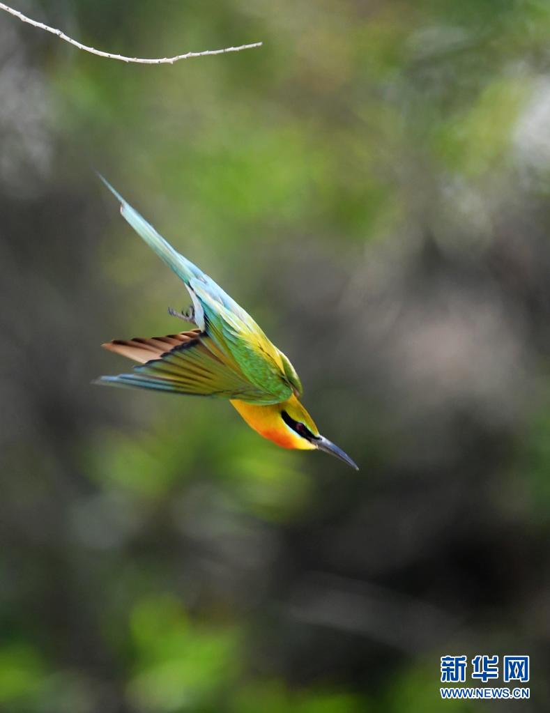 在厦门五缘湾栗喉蜂虎自然保护区拍摄的一只栗喉蜂虎飞下枝头觅食(4月30日摄)。