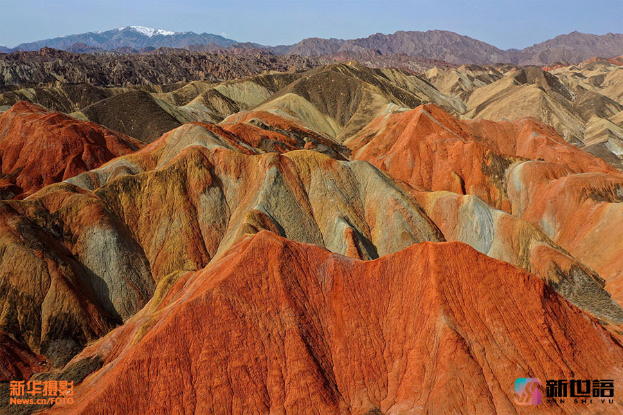 七彩丹霞地貌群位于甘肃省临泽县倪家营乡南台村,东西长45约公里,南北宽约10公里,为国家5A级旅游景区。阳光下的甘肃省张掖七彩丹霞地貌群色彩斑斓,雄伟壮观,摄人心魄。新世语/吴学珍(声明:凡带有水印的图片,系版权图片,受法律保护,未经许可请勿转载。)