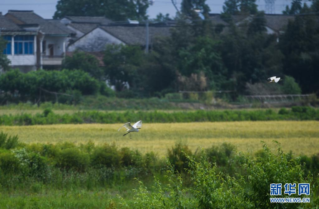 初夏时节,浙江省湖州市吴兴区东林镇万亩田野里的金黄的小麦、绿色的桑叶、彩色的花海还有白鹭等野生鸟类等构成了一幅五彩田园的美丽景色。新华社记者 徐昱 摄