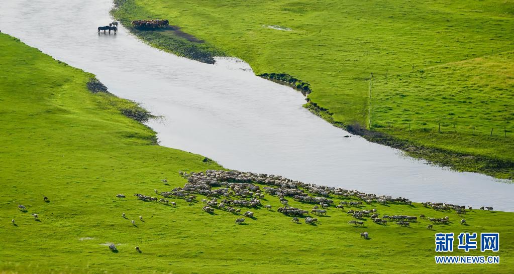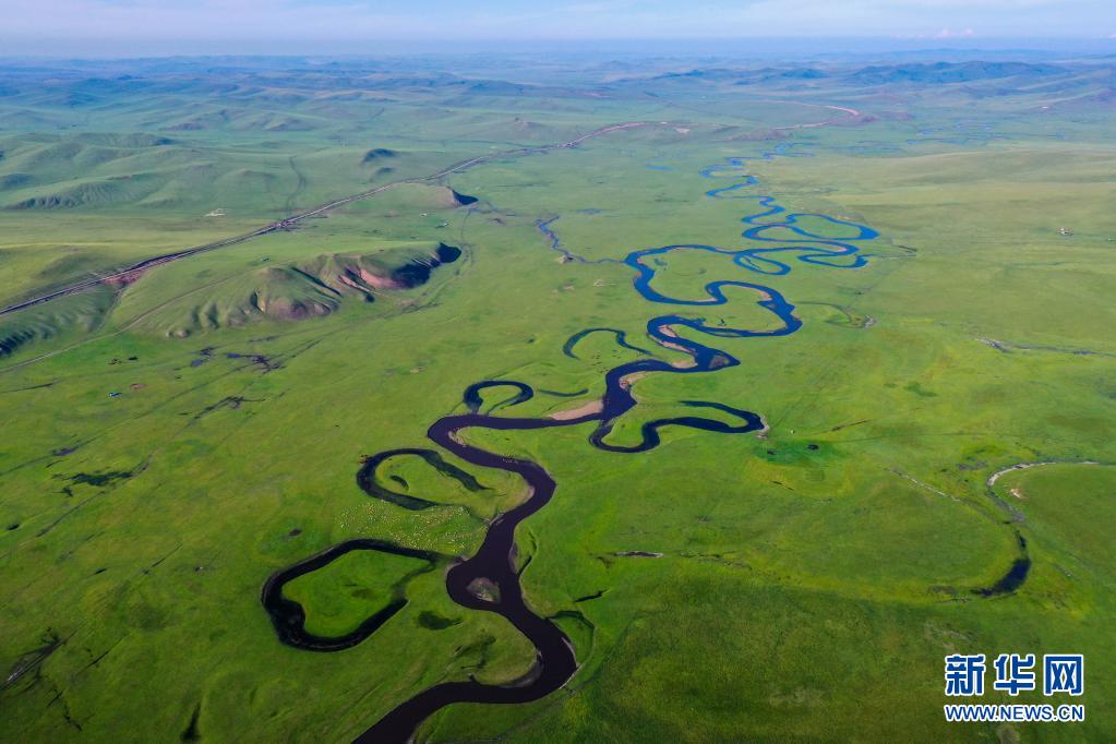 盛夏来临,内蒙古呼伦贝尔大草原进入一年中最美的时节。蜿蜒曲折的莫日格勒河位于陈巴尔虎旗境内,如一条丝带飘落在草原上,美不胜收。新华社记者 连振 摄