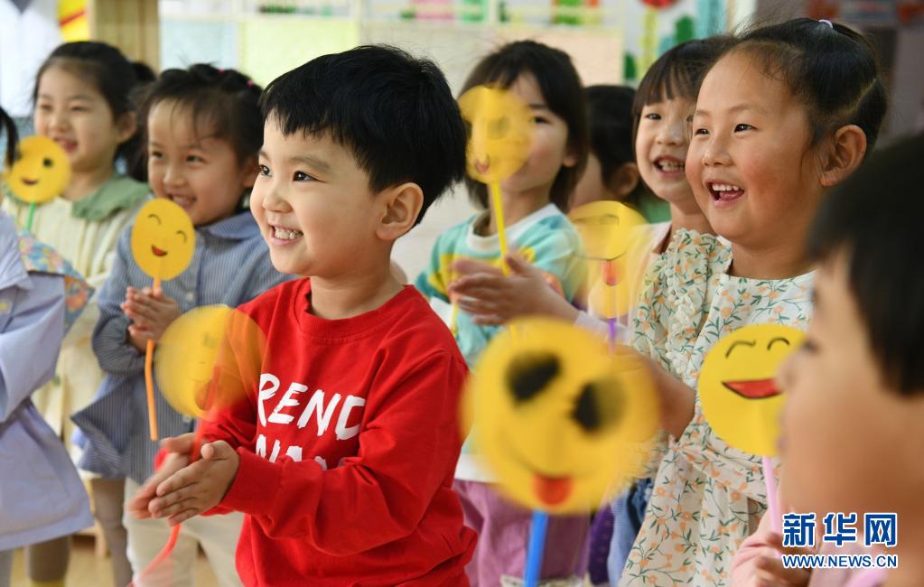 5月7日,河北省石家庄市栾城区第一幼儿园的小朋友在展示自己制作的笑脸卡。