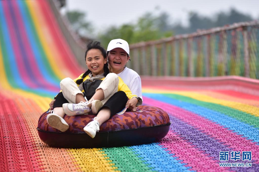 5月2日,游客在贵州省丹寨县龙泉镇展良村“乡村游乐场”玩彩虹滑道。