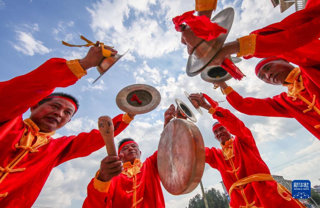 10月3日,在贵州省岑巩县大有镇团结社区,民间艺人在敲击“思州战鼓”,欢庆国庆。