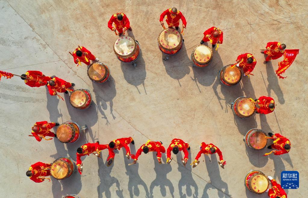 10月3日,在贵州省岑巩县大有镇团结社区,民间艺人在敲击“思州战鼓”,欢庆国庆(无人机照片)。