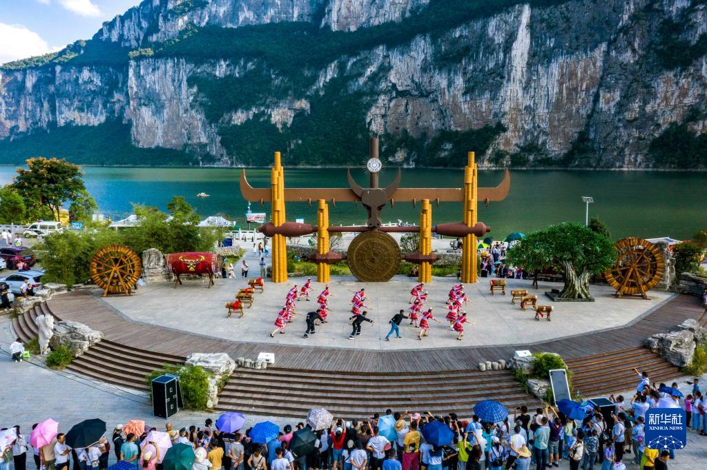 10月3日,贵州省黔西市新仁苗族乡化屋景区舞蹈队为游客表演“苗韵化屋”舞蹈(无人机照片)。