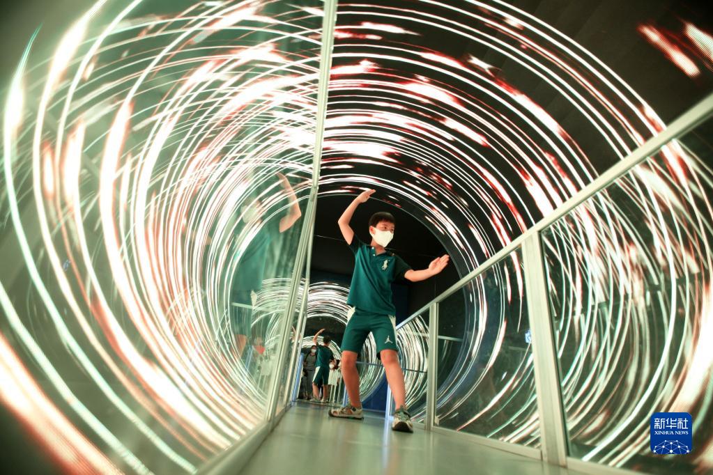 10月3日,一名小朋友在南京科技馆“眩光通道”里玩耍。