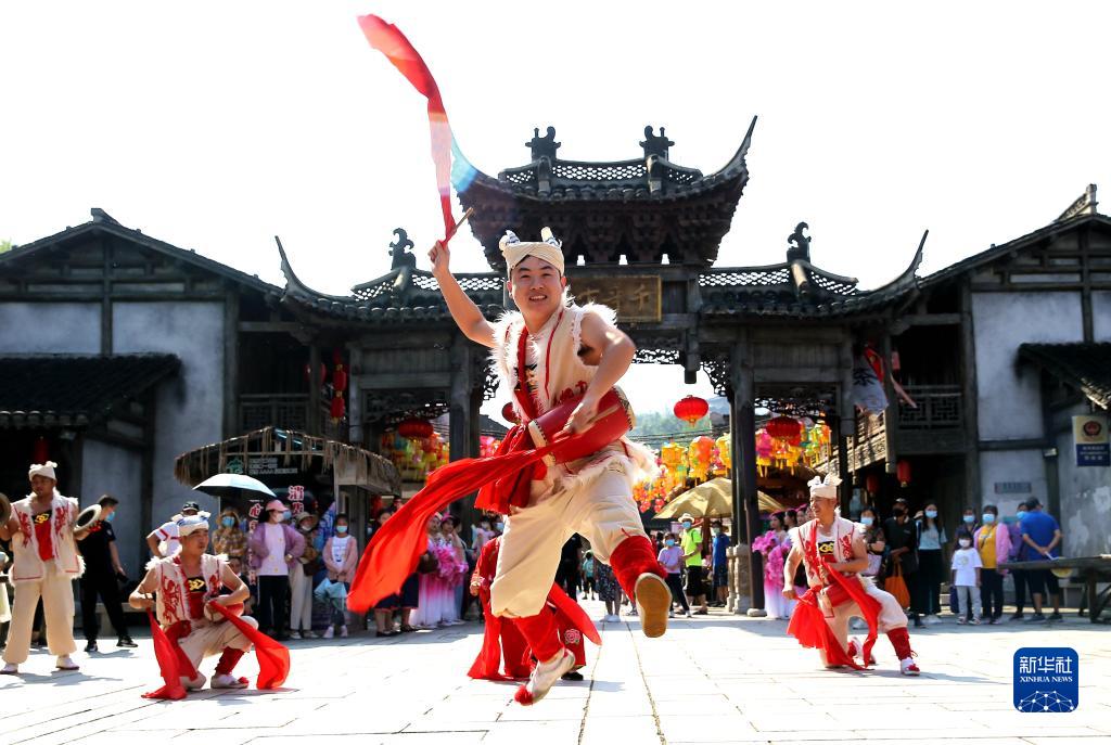 10月3日,在江苏镇江句容市宝华山国家森林公园,演员为游客表演腰鼓。