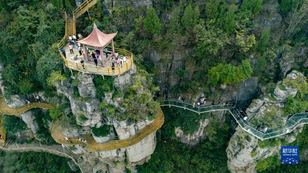 10月6日,在山东省枣庄市山亭区葫芦套风景旅游区,游客在山间玻璃栈道上参观游览(无人机照片)。