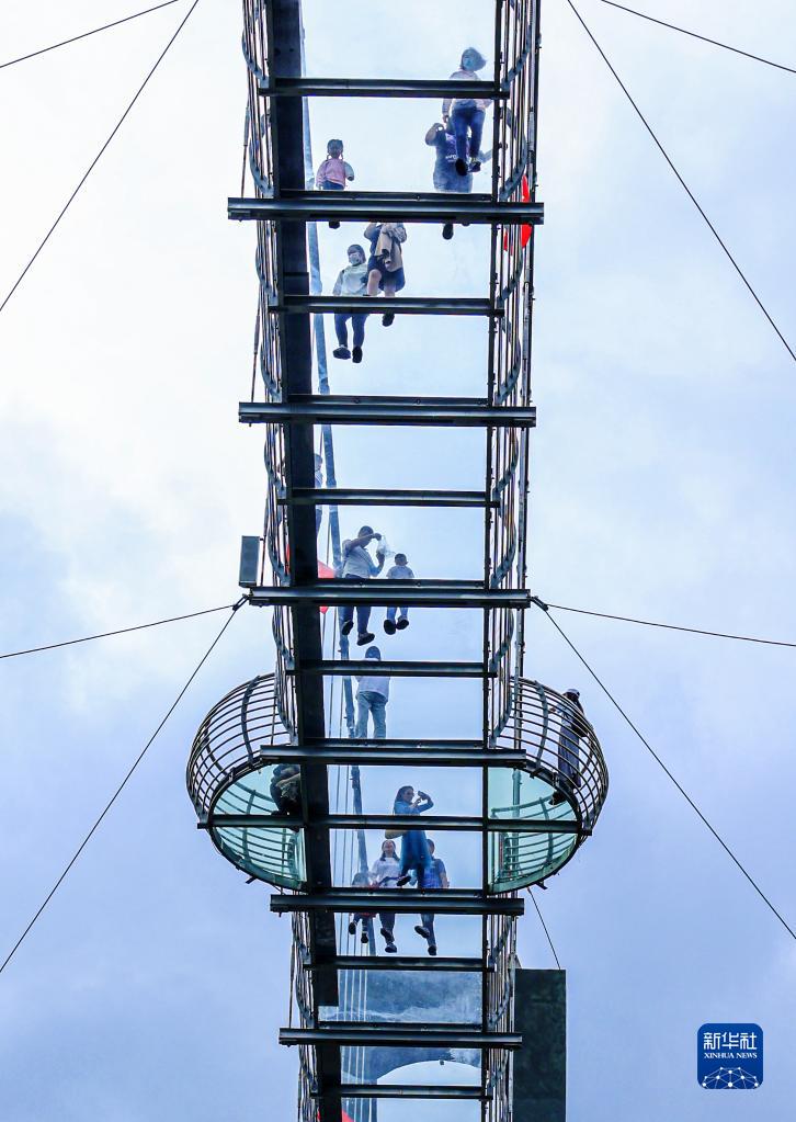 10月6日,在山东省荣成市西霞口神雕山野生动物世界,游客在玻璃栈道上游览观光。