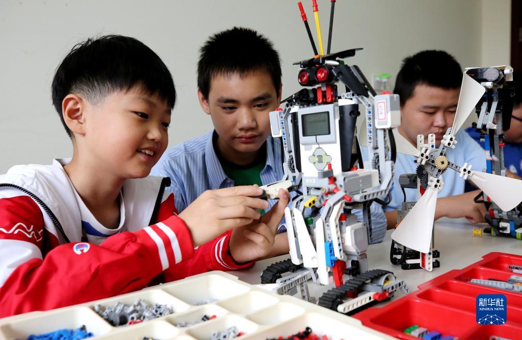 10月6日,几名学生在山东省枣庄市科技馆里学习组装智能机器人。