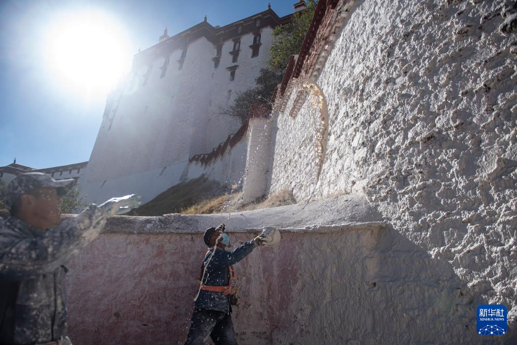 近日,西藏布达拉宫开启年度“换新装”工程。工作人员将牛奶、蜂蜜、藏红花、白灰等材料混合,经过滤后对布宫墙体进行喷涂,人力难以抵达的地方由专业人员在空中喷洒涂料,将这座宏伟宫殿的墙体粉刷一新。 新华社记者 孙瑞博 摄pagebreak