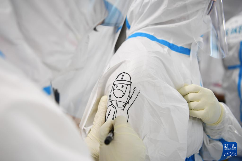 “猎鹰号”硬气膜实验室工作人员普臣惠(左)给同伴的防护服上画上卡通图案,为同伴加油鼓劲。