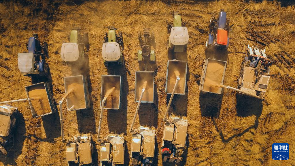10月20日,在辽宁省铁岭市铁岭县新台子镇西三家子村,万鑫水稻种植专业合作社把机械化收割下来的水稻装车(无人机照片)。 新华社记者 杨青 摄pagebreak