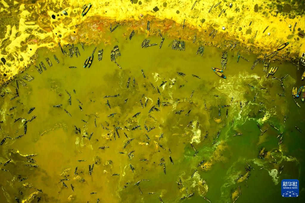 10月24日在孟加拉国苏纳姆甘杰一条河流上拍摄的采砂的船只(航拍照片)。 新华社发(萨利姆摄)