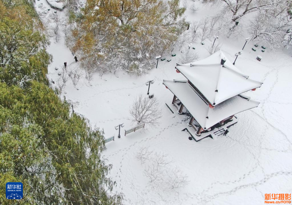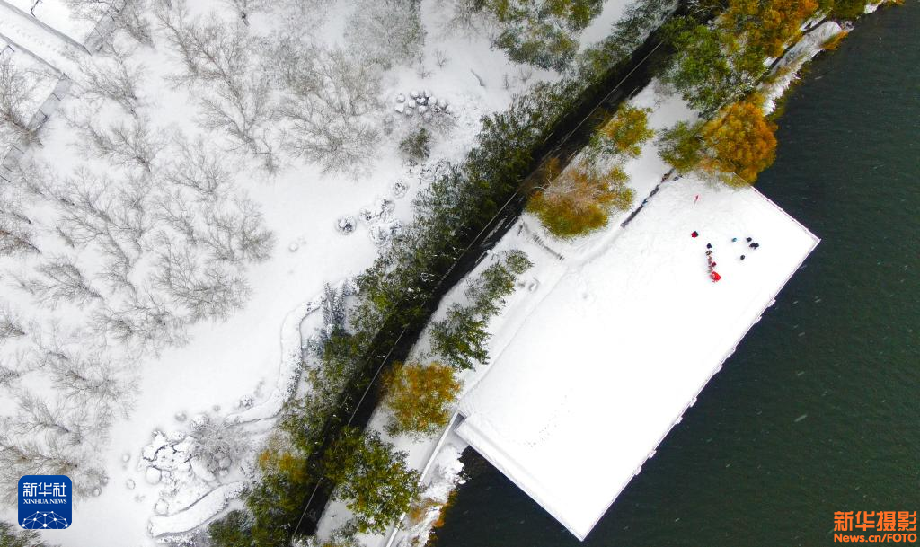 11月9日拍摄的沈阳市和平区沈水湾公园雪景(无人机照片)。新华社记者 杨青 摄