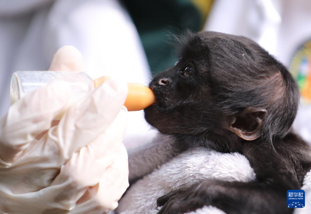 12月16日,保育员给黑丛尾猴幼崽“丛丛”喂奶。