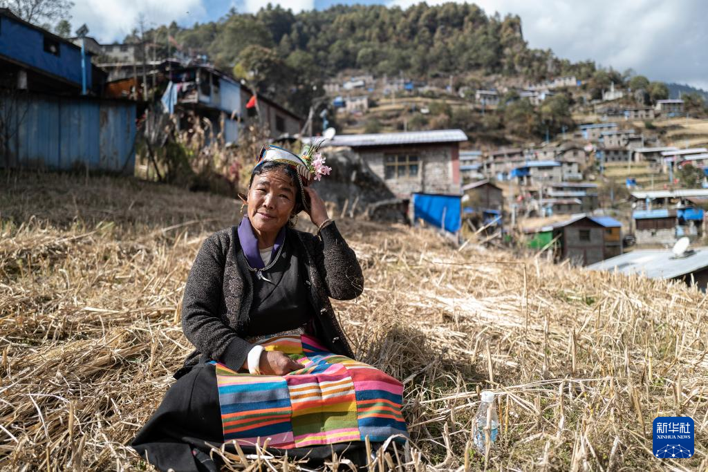 非遗陈塘夏尔巴歌舞代表性传承人朗嘎在山坡上演唱时调整自己的头饰(11月27日摄)。
