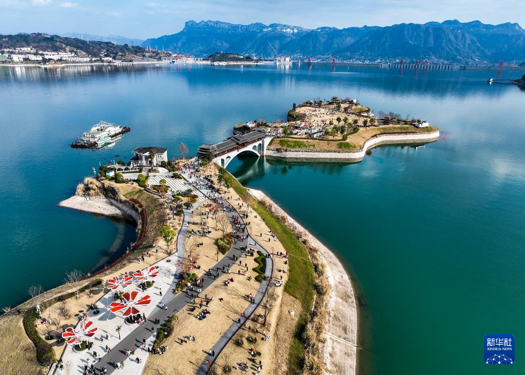 2月3日,人们在三峡大坝附近的湖北省宜昌市秭归县木鱼岛休闲公园游玩(无人机照片)。