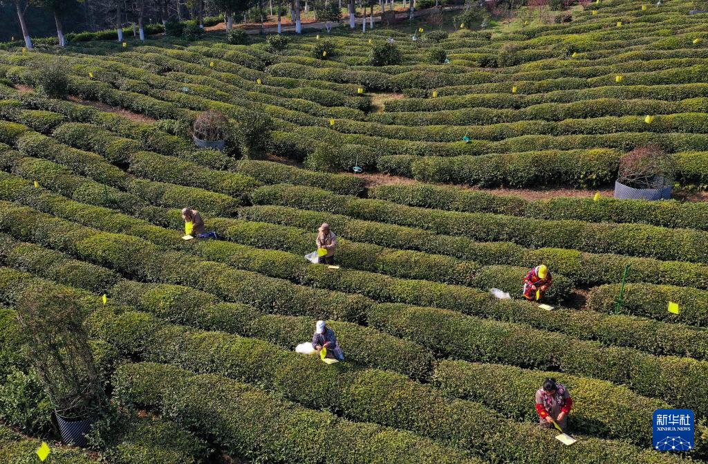 2月25日,茶农在安徽省黄山市徽州区茶园安插诱虫黄板(无人机照片)。