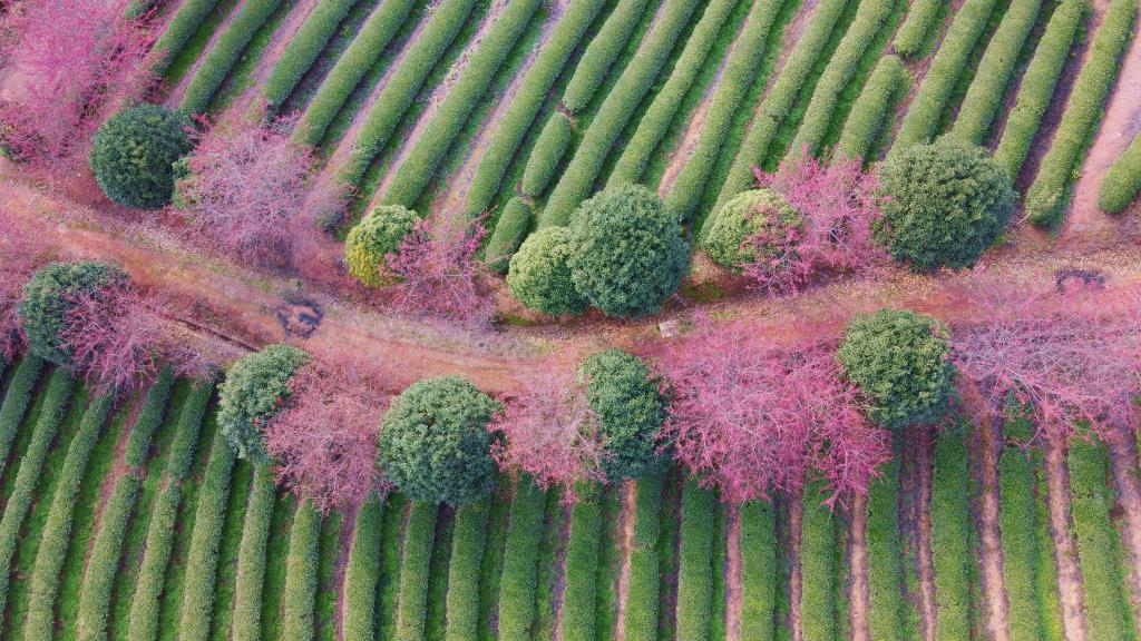 2月25日在福建武夷山拍摄的樱花茶园景色(无人机照片)。