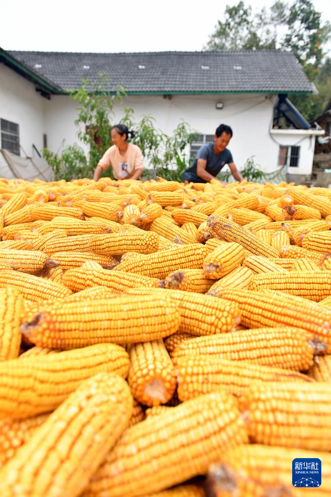 9月18日,湖北省宜昌市秭归县九畹溪镇穿心店村的村民在自家晒台上翻晒玉米。