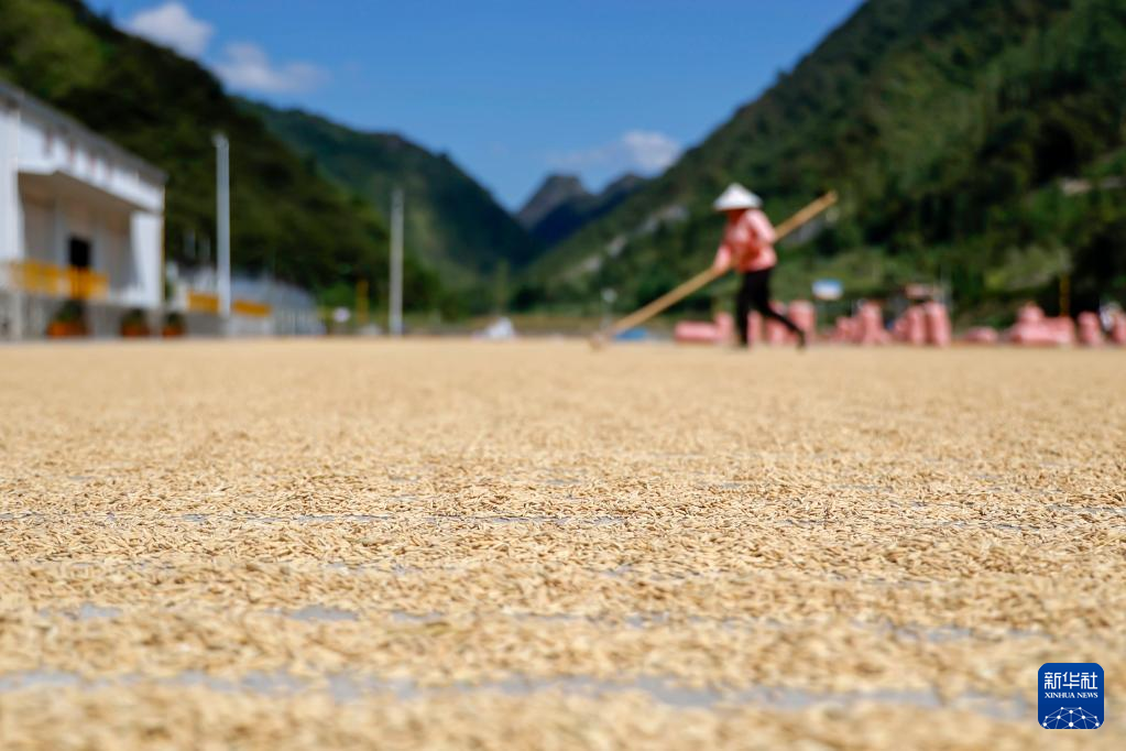 9月18日,贵州省黔南布依族苗族自治州罗甸县逢亭镇祥脚村的村民在晾晒稻谷。