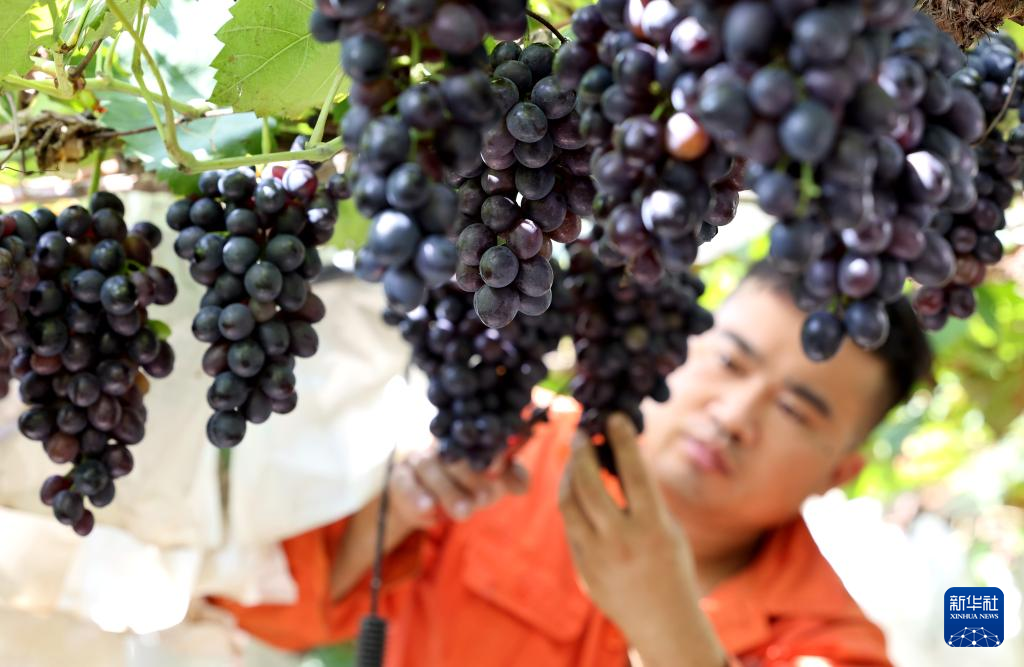 9月17日,山东省枣庄市齐村镇前良村农民在果园采摘葡萄。
