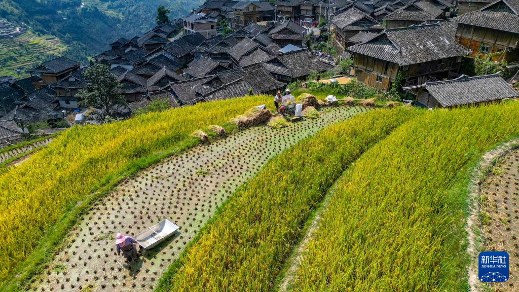 9月18日,贵州省黔东南苗族侗族自治州从江县加榜乡加车村的村民在田间抢收稻谷(无人机照片)。