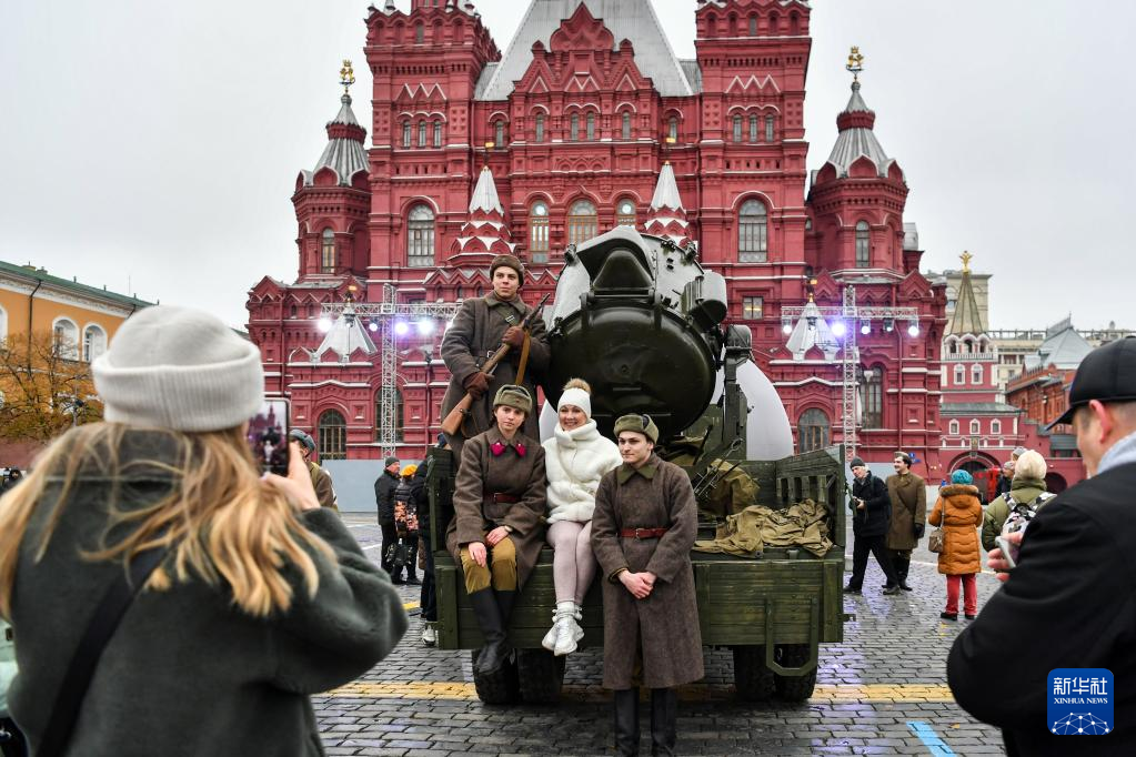 11月7日,在俄罗斯首都莫斯科,人们在以纪念1941年苏联红场阅兵式为主题的露天展览上拍照。