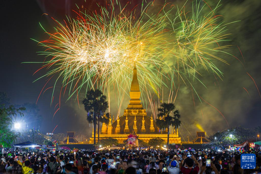 这是11月8日在老挝首都万象拍摄的塔銮上空的烟花表演。