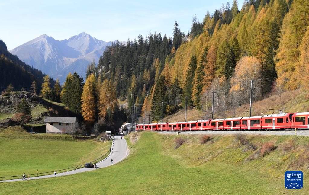 10月29日,世界最长窄轨客运列车在位于瑞士阿尔卑斯山区的雷蒂亚铁路网上行驶。