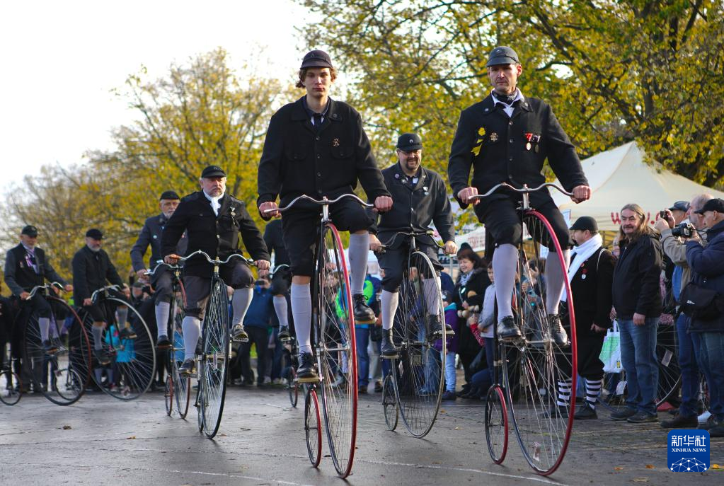 11月5日,参赛者在捷克首都布拉格参加传统高轮自行车比赛。