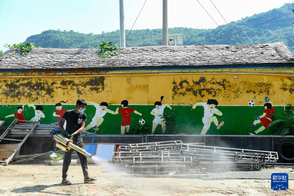 8月15日,北京市房山区河北镇中心幼儿园东庄子分园教师李笑博在园内消杀。