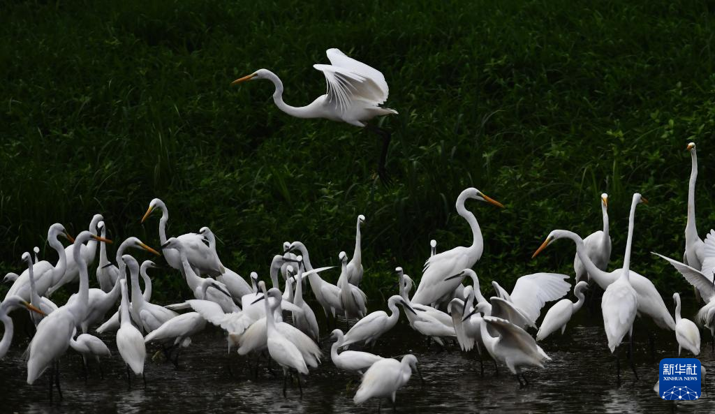 近日,成群的白鹭在山东省滕州市荆河水域觅食、飞舞。