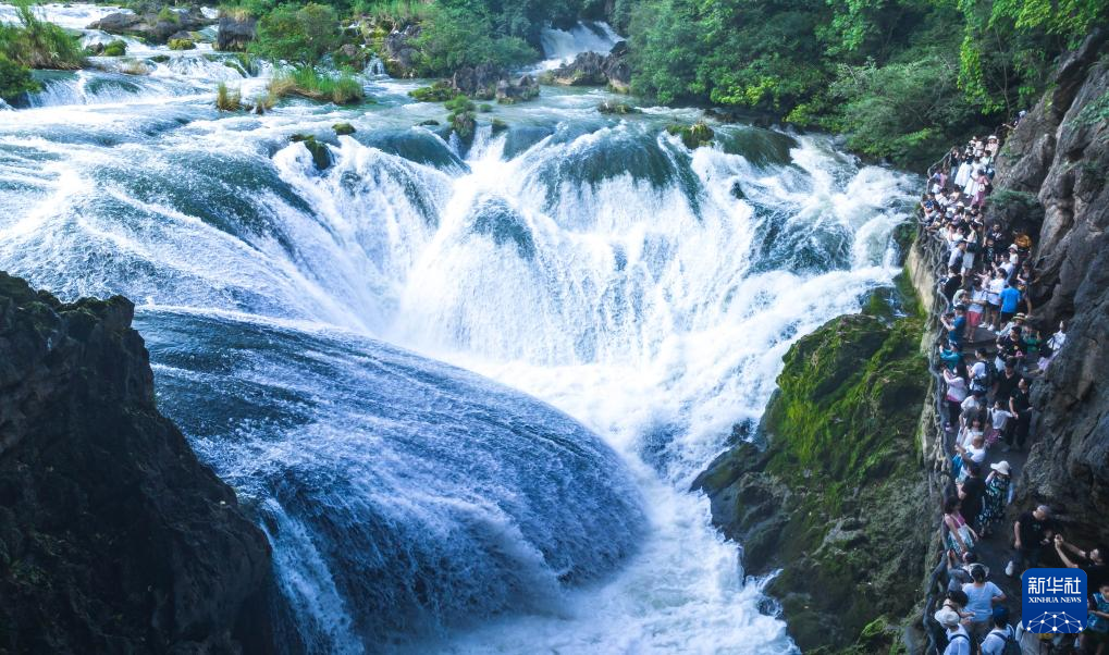 8月16日,游客在贵州省安顺市黄果树瀑布景区游览(无人机照片)。