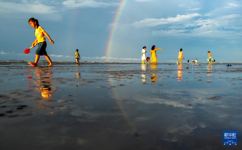 8月14日,游客在金滩出现的彩虹下游玩。