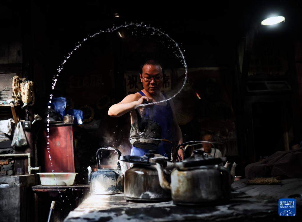 老板李强在给客人表演用壶中的水在空中甩出造型,这是他的拿手绝活(8月7日摄)。