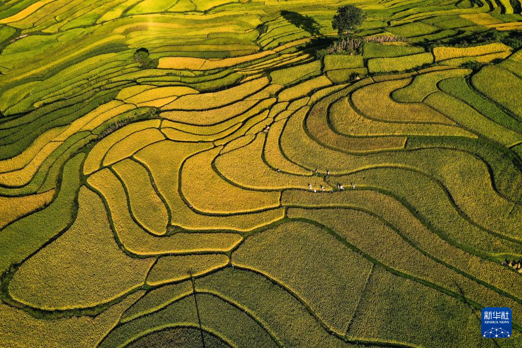 白露将至,贵州省黔南布依族苗族自治州贵定县沿山镇腊利梯田里的水稻逐渐成熟,呈现出一幅丰收在望的秋日画卷。